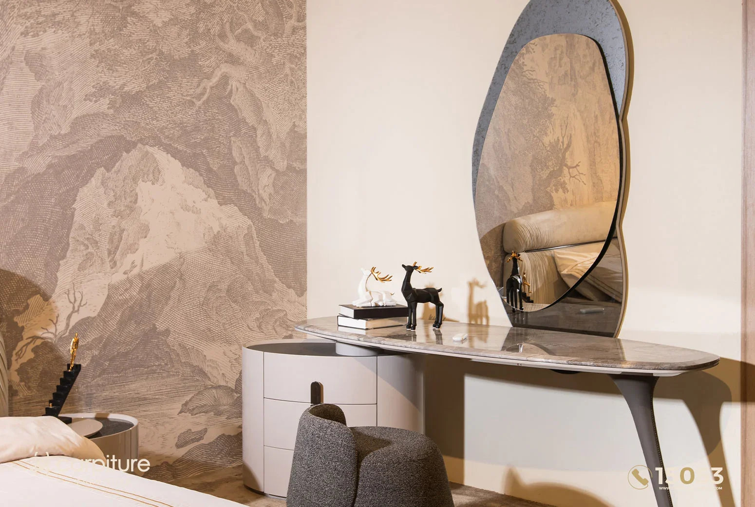 Bed + 2 chests of drawers + wardrobe + dressing table + mirror+ pouf + bench